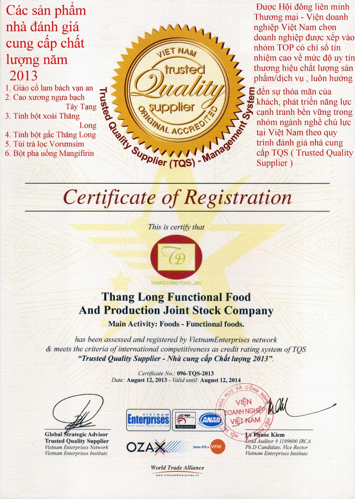 đã được Hội đồng Liên minh thương mại – Viện doanh nhân Việt Nam và một số tổ